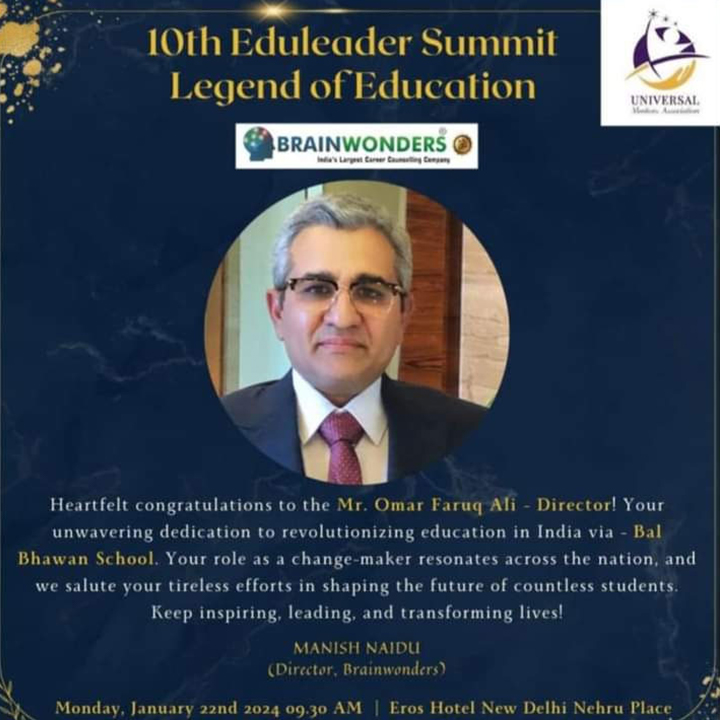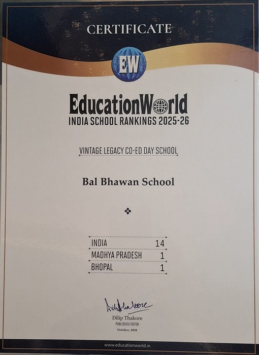 It gives us immense pride and joy to share wonderful news with you - Bal Bhawan School has been ranked No. 1 in Bhopal and in Madhya Pradesh , and stands 14th in India, in the Vintage Legacy Co-Ed Day School Category (by the EducationWorld India School Rankings 2025β26). The award was received by our Head of Bio Department and Senior Lecturer, Mrs. Anita Gupta, on behalf of the school. This recognition is not just a reflection of our academic excellence, but also of the all-round development, values, and opportunities we strive to provide our children every day.It is the result of the unwavering dedication of our teachers, the hard work of our students, and the constant support and trust of our parent community.We believe that achievements like these are milestones that encourage us to aim higher and work even harder for the bright future of our children.